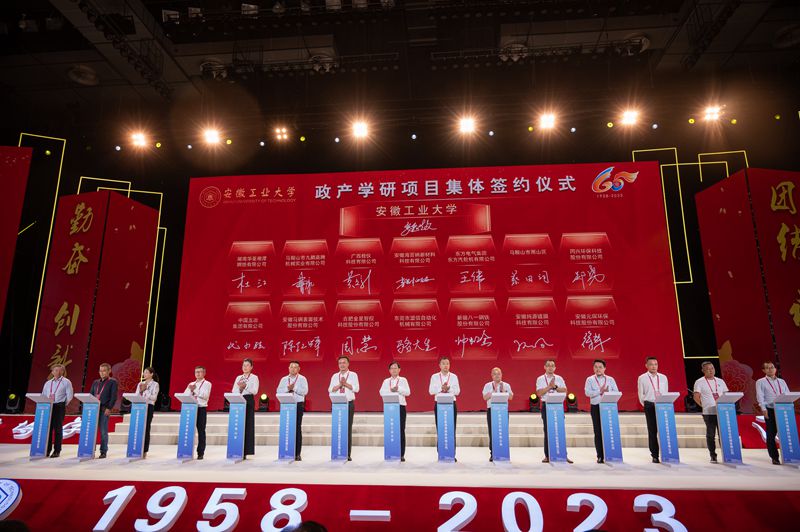 魏先文代表学校,与湖南华菱湘潭钢铁有限公司副总经理杜江,马鞍山市九鹏嘉腾机械实业有限公司总经理曹承,广西桂仪科技有限公司董事长黄文新,安徽海百纳新材料科技有限公司董事长魏柏林,东方电气集团东方汽轮机有限公司领军人才王伟,马鞍山市雨山区委常委、雨山经济开发区党工委书记、管委会主任蔡田词,同兴环保科技股份有限公司总经理郑勇,中国五冶集团有限公司党委委员、副总经理、总工程师代小强,安徽马钢表面技术股份有限公司党委书记兼副总经理陈红辉,合肥金星智控科技股份有限公司副总经理周慧,东莞市盟信自动化机械有限公司技术总监张家正,新疆八一钢铁股份有限公司首席专家帅虹全,安徽纯源镀膜科技有限公司董事长张心凤,安徽元琛环保科技股份有限公司董事长徐辉等签约单位代表,签订了15项合作协议,合同金额总计1.05亿元。与会人员共同见证了重大政产学研项目集体签约。