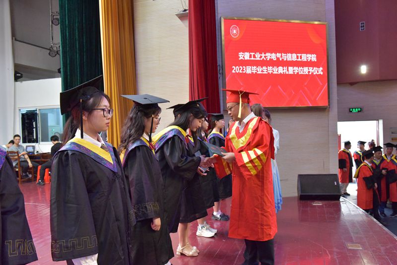 典礼在庄严的国歌声中拉开序幕。电气与信息工程学院党委书记丁忠利宣读了安徽省优秀毕业生、校优秀毕业生的表彰决定,院长王兵宣读了2023届校友联络员名单。在主席台就座的领导为安徽省优秀毕业生、校优秀毕业生颁发了荣誉证书,为校友联络员颁发了聘书。