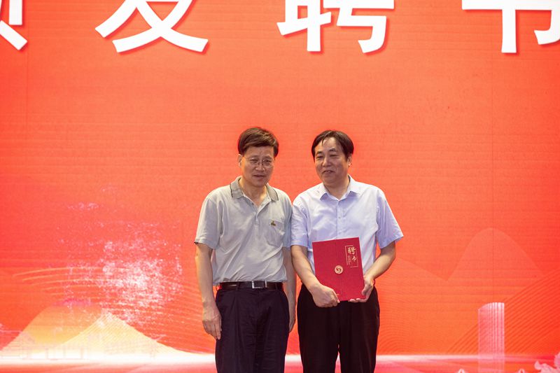 长江产业经济研究院院长刘志彪为安徽中心主任洪功翔教授、陈东教授颁发聘书。