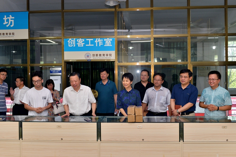 王晓焱一行实地走访了创新教育学院,观看了“创新创业教育”展板,听取了我校关于工程实践和创新创业教育工作思路、经验特色和取得成效的汇报。在创客工作坊,王晓焱一行考察了我校学生创新实践活动环境,看望了正在备赛的学生,饶有兴致地观看了模拟实训,对我校构建校院两级创新创业实践教育体系、推行“一专业一竞赛”的做法和成果给予了充分肯定。王晓焱一行还参观了工程文化墙和学子创新荣誉墙,对我校在各级各类学科竞赛和创新创业大赛取得的佳绩给予高度评价。