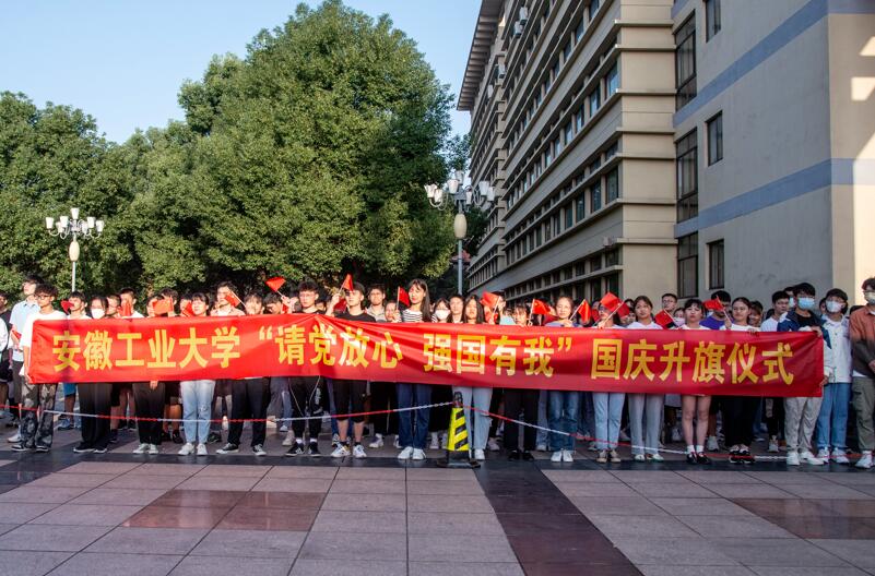 上午7时,校国旗护卫队擎着鲜艳的五星红旗,喊着嘹亮的口号,迈着整齐的步伐向旗台迈进。随着国歌声响起,五星红旗冉冉升起,全体师生行注目礼,并齐唱国歌。升旗仪式后,校青年马克思主义培养工程培训班学员代表、校学生会主席团成员吕永祥作了国旗下的演讲。随后,4名身着印有“青春向党,奋斗强国”红色T恤的学生代表在国旗下用铿锵而又坚定的声音为祖国献词,4声响亮的“请党放心,强国有我”的誓言表达了全体安工大人对祖国的深情礼赞和真挚的爱党爱国爱校情感。艺术与设计学院合唱团成员领唱《安徽工业大学校歌》和《我和我的祖国》,清脆悦耳的歌声在清晨的校园里回荡。